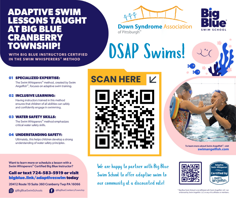 DSAP is excited to partner with Big Blue Swim School to make adaptive swim lessons more accessible. Families can receive up to $400 per swimmer with Ds each year provided by DSAP to apply toward the lesson package that best fits their child’s needs and schedule. These lessons are designed for children of all abilities, with trained instructors who tailor teaching methods to each swimmer while building confidence and essential water safety skills.