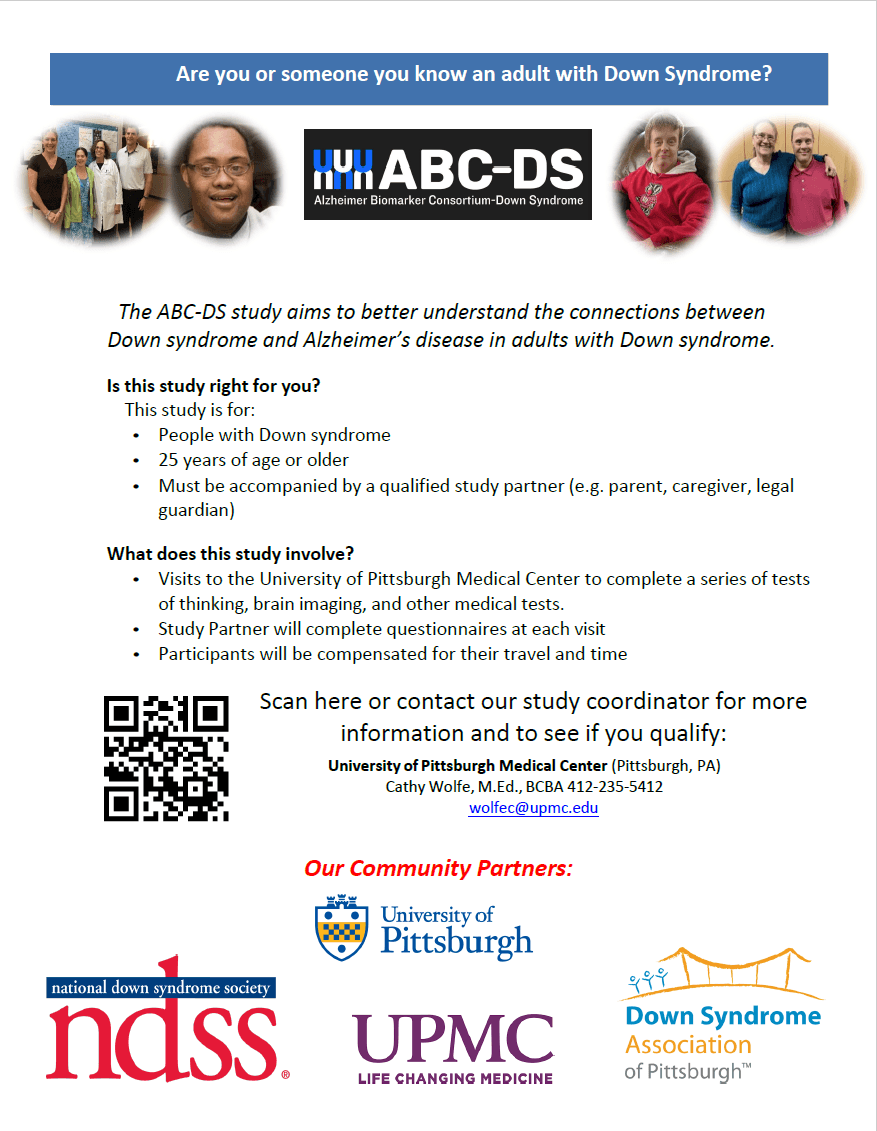 ABC-DS has a crucial mission: to spot the early signs of Alzheimer’s in adults with Down syndrome. This includes identifying sensitive neuropsychological measures of cognitive decline, blood-based proteins, metabolites and genetic biomarkers, along with neuropathological features. We aim to trace the journey from healthy aging to mild memory problems, and finally, to Alzheimer’s. Together, we’ll work to uncover hidden links that give us a fighting chance against Alzheimer’s disease.