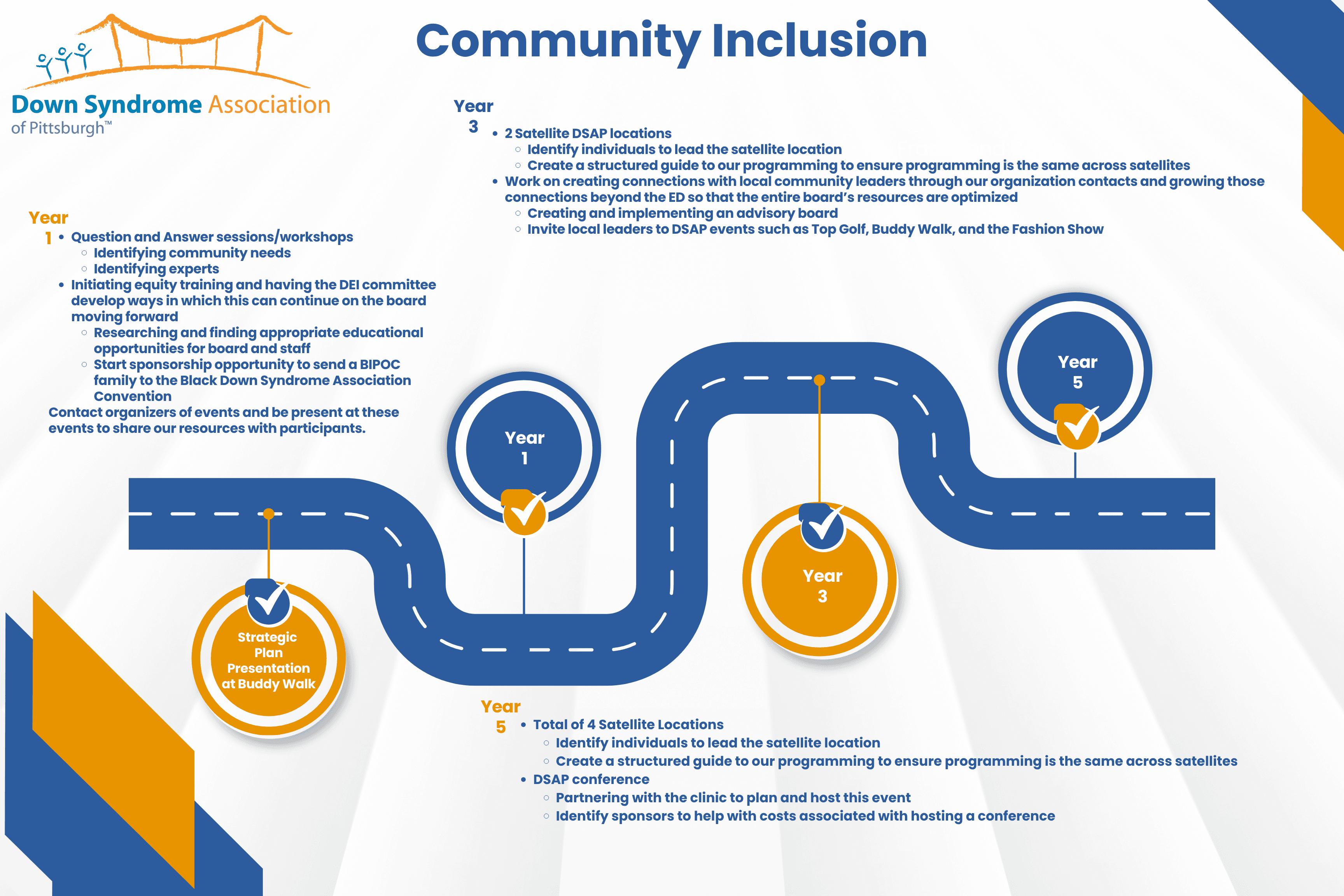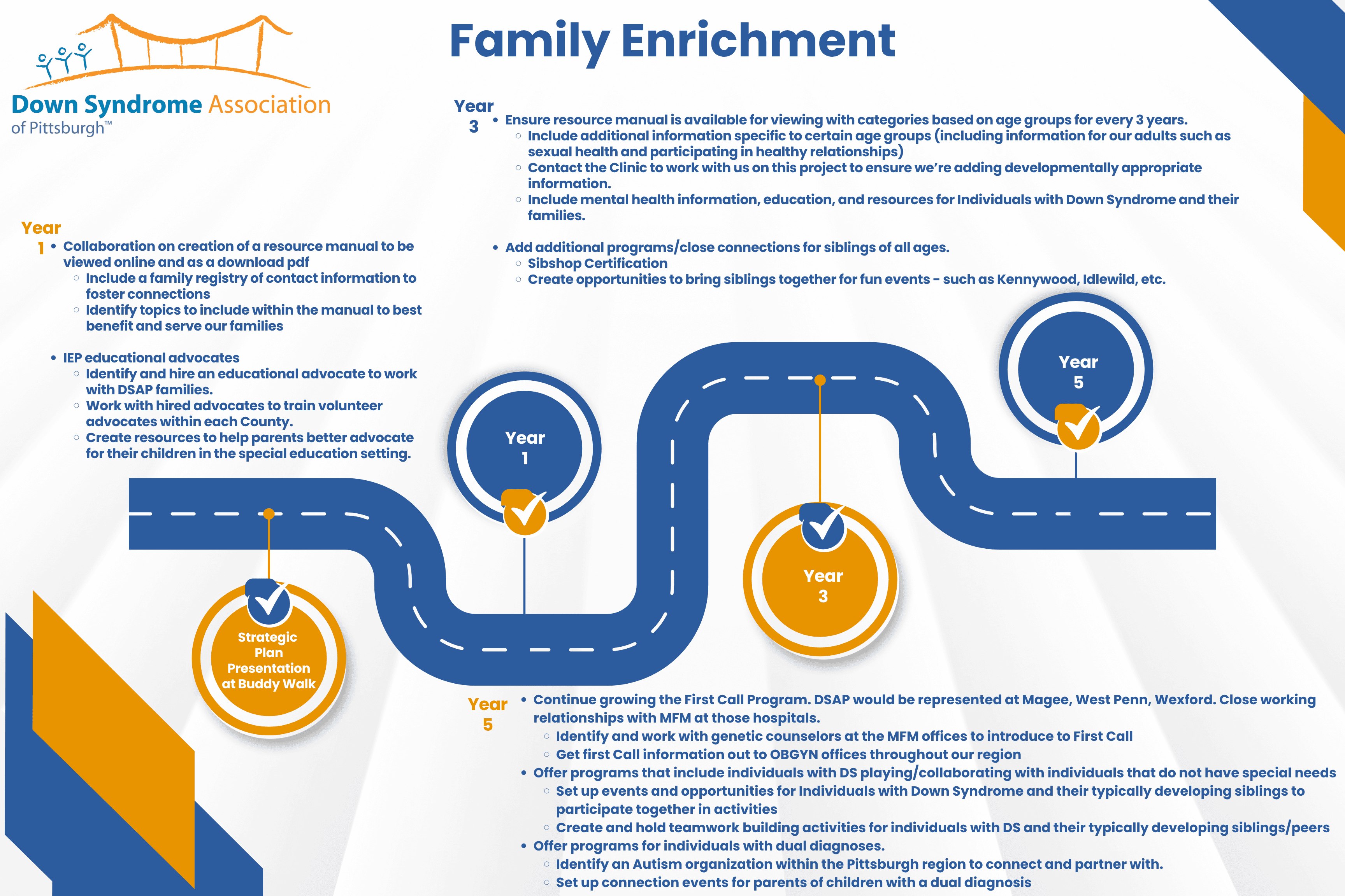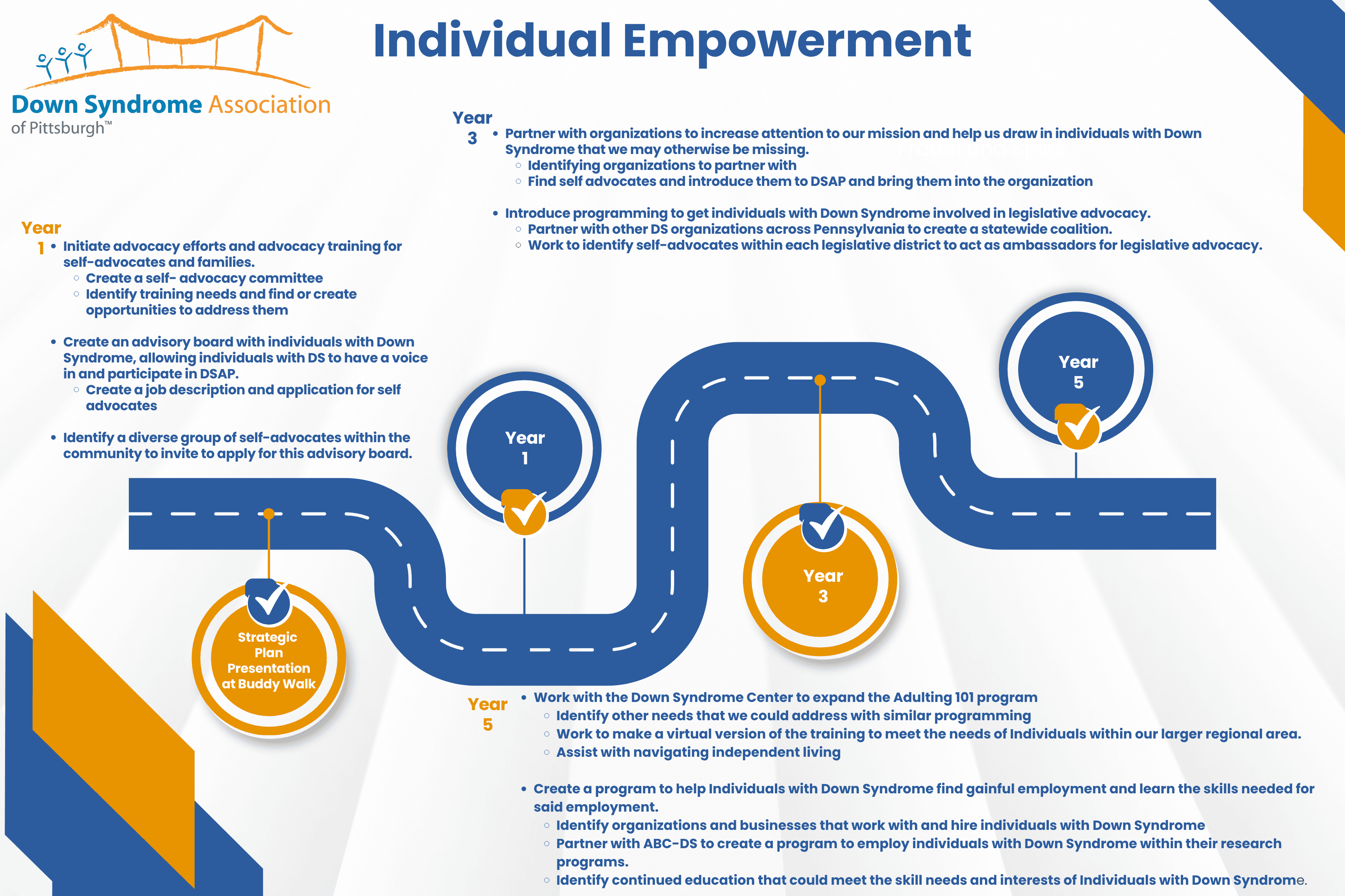 At the Buddy Walk on October 18th, 2025 we unveiled our strategic plan for the next 5 years. Our plan is categorized by our 3 Pillars from our mission statement: individual empowerment, family enrichment, and community inclusion.